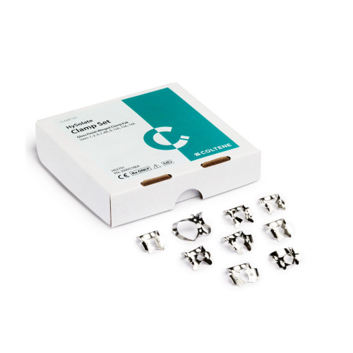 Las abrazaderas HySolate con sistema de 9 alas y acabado brillante de Coltene son abrazaderas Fiesta de acero inoxidable de alta calidad con código de color y acabado brillante. Se colocan sobre el diente para fijar el dique dental y retraer el tejido del área circundante, simplificando la fijación.